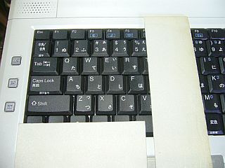 これは、珍しいタイプ_機構_だが、上蓋_パームレスト部など_から「表示部」を外さずにくっ付けたままで分離するのが正解のようだ。_図5 液晶面は白紙でカバーしてある_