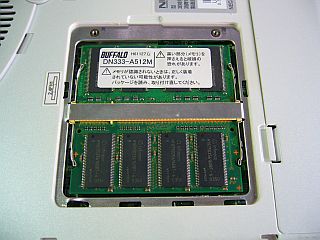これは、メモリが入っていないせいだろう!と裏蓋を開けてみたら、ちゃんとPC2700−512MB+256MBが入っていた!_左写真_
