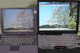 液晶画面は、プレゼンテーション時に水平展開や画面の方向転換も出来るそうなので、一応、やってみました。面白そうだけど、やはり液晶画面は視野角制限の問題があるし、_画面輝度が落ちているせいもあって_視認性もイマイチ。