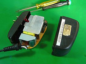 もしかしたら、「コード線切れ」かな?と、アダプタを分解して調べました。_左写真_