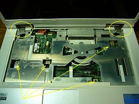 このマシンの分解は、あまり難しくなく、手始めにキーボード奥の「細い桟」を外してから、順に奥へ下へ下へと外して行けきました。