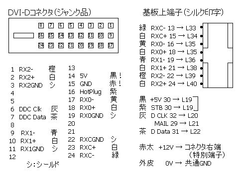 尚、色名は、単にDVIコネクタのケーブル内の線の色なので、汎用性は無かろうと思います。(特に、5Vに黒!、GNDに赤!を使っている処など、尋常ではない!?)