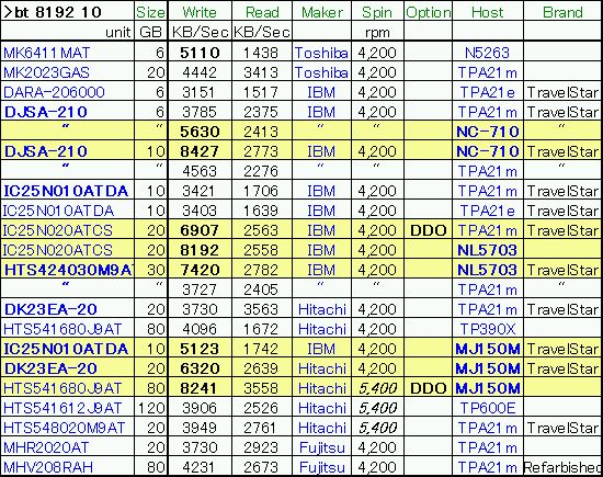 上表を見ると、やはり成績上位は、PC本体依存が強いようで、本体は、EPSON機(NC-710,NL7503)とMebius機の一部(MJ150M)が好成績でした。