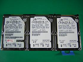左写真(とその<クリック>で)は、使っていた/っている/おうとしているHDD(左:40GB,中:80GB,右:120GB)で、80GB以上は5400rpm品です。