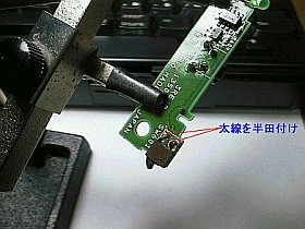 修繕は、まず、薄手の両面テープでSWを所定位置に固定。次に、やや細(太?)目の錫メッキ単線を半田付けして、電極の代り、および固定補助用とします。