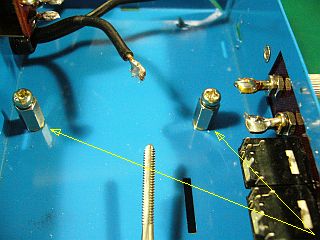 上から3mmφのタップを切って、そこへポストを捻じ込んだのだが、これは裏側の台座板が邪魔して、ビス・ナットが使えなかったからだ。