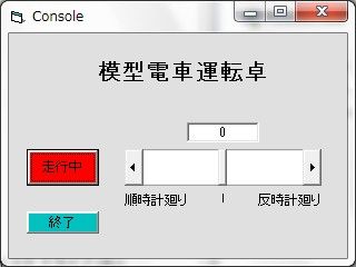 第1段階の実行プログラム(TrainCtrl.exeの圧縮ファイル:危険は無いと思うが実行無保証!)では、極くシンプルな「操作卓」(図9)だが、その内、「記憶モード」、「再生モード」などを組み込みたいと思っている。