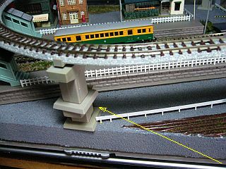 そこで、「橋脚」ジャンクを長短ばらばらで買い込み、それと新たに市販のレール・セットTOMIX 91080(レールパターンSA \1,632税込み)を見付けて、それに置き換えた。(図1)