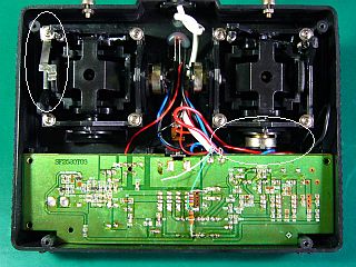 中の機構を改造して、「スロットル」側に付いていたVR(可変抵抗器)を、反対側に移して「エルロン」として使えるようにした。(左写真)