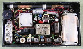簡単な表が、電池ケース蓋の裏側に貼ってあります。それによると、中波帯(540〜1600KC)短波帯(3.8〜12MC)受信可能な7石2バンド・スーパ。(だそうです。確かにトランジスタ数を勘定したら、7個あります)