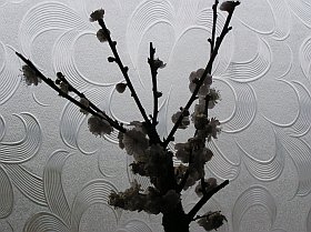 枝が窓ガラスを擦った途端、枯れた花びらがばっと散ってしまった。慌てて掃き寄せたが、風情も何もあったものではない。(左写真<クリック>で、その様子)