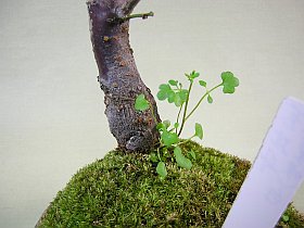 おゃ、この鉢にも小さな雑草が!(左写真、<クリック>で、それのアップ) この小草(良く分からないのだが)、クローバ辺りではないかと想像している。