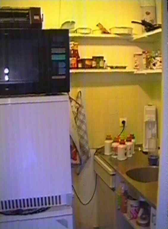 Blick in die (enge) Küche. Hinterm Kühlschrank steht übrigens